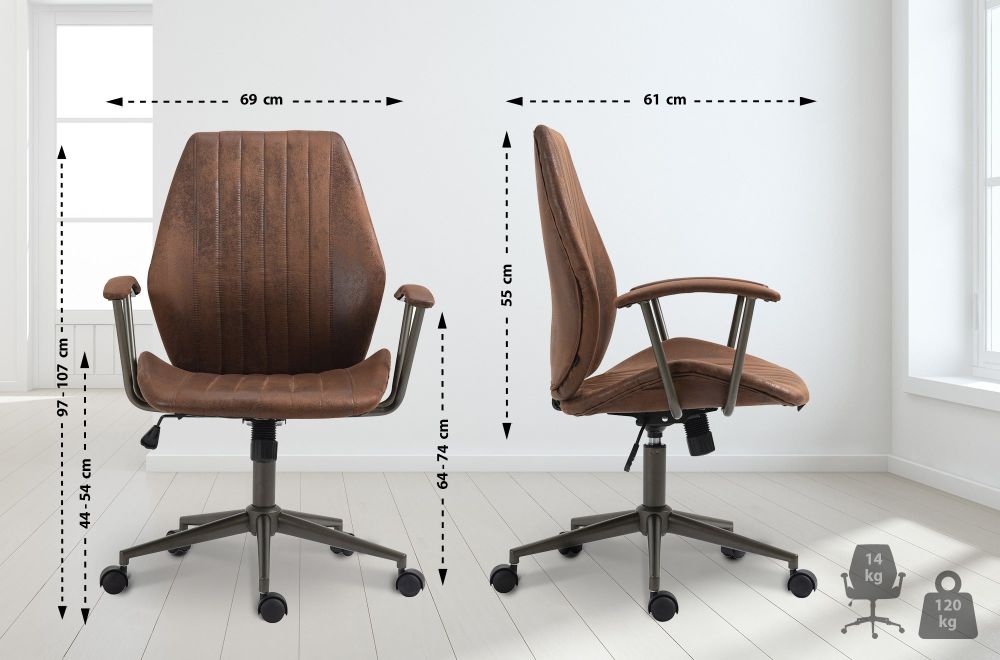 Der Bürostuhl Nampa vereint industriellen Charme mit durchdachter Ergonomie. Der hochwertige Kunstlederbezug und die weiche Polsterung sorgen für ein angenehmes Sitzgefühl – auch über viele Stunden hinweg. Die ergonomisch geformte Rückenlehne in S-Form fördert eine gesunde Körperhaltung, während der integrierte Wippmechanismus für zusätzliche Bewegungsfreiheit sorgt. Dank stufenlos verstellbarer Sitzhöhe lässt sich der Stuhl an jede Körpergröße anpassen. Das schwarze Metallgestell mit Drehkreuz steht sicher auf fünf Leichtlaufrollen und ermöglicht flüssiges Rollen auf allen Bodenarten. Ob im Homeoffice oder im klassischen Büro – der Nampa bietet Komfort und Stabilität im markanten Look.