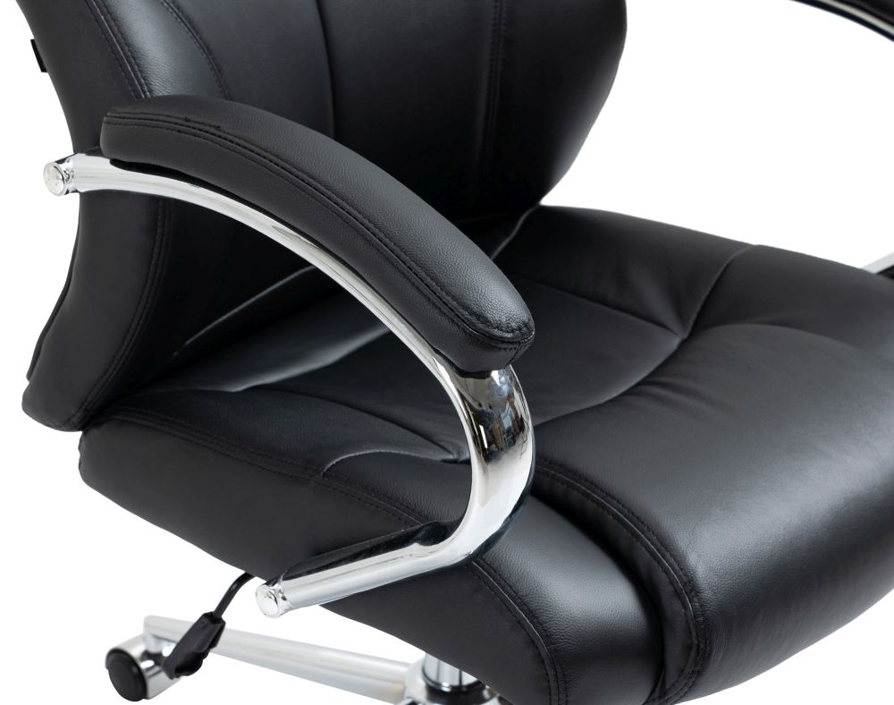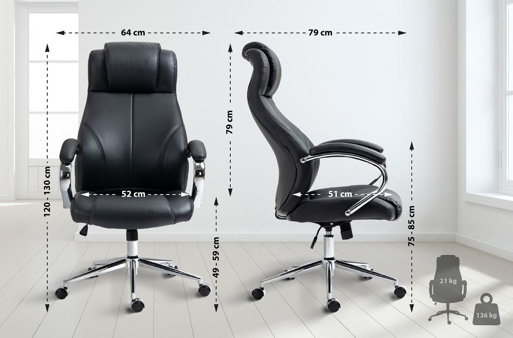 Der Bürostuhl Salford bietet höchsten Sitzkomfort kombiniert mit einem zeitlosen, professionellen Design. Die großzügige Polsterung an Sitzfläche, Rückenlehne und Armlehnen sorgt für ein angenehmes Sitzgefühl – auch über längere Zeiträume hinweg. Die ergonomisch geformte Rückenlehne in S-Form mit integrierter Kopfstütze fördert eine gesunde Haltung. Die sogenannte Waterfall-Sitzkante entlastet die Oberschenkel und verbessert die Durchblutung. Der hochwertige Bezug besteht an den Kontaktflächen aus langlebigem Echtleder, während seitliche Bereiche mit pflegeleichtem Kunstleder überzogen sind. Das stabile Metallgestell in Chromoptik gewährleistet zuverlässige Standfestigkeit. Die Sitzhöhe ist stufenlos verstellbar, und die Spannung des Wippmechanismus kann individuell angepasst werden. Fünf leichtgängige Rollen ermöglichen volle Beweglichkeit auf Teppich- und Hartböden.