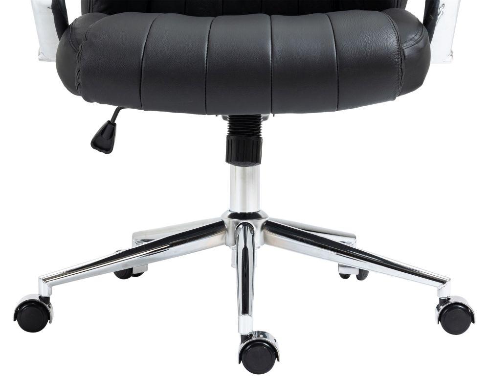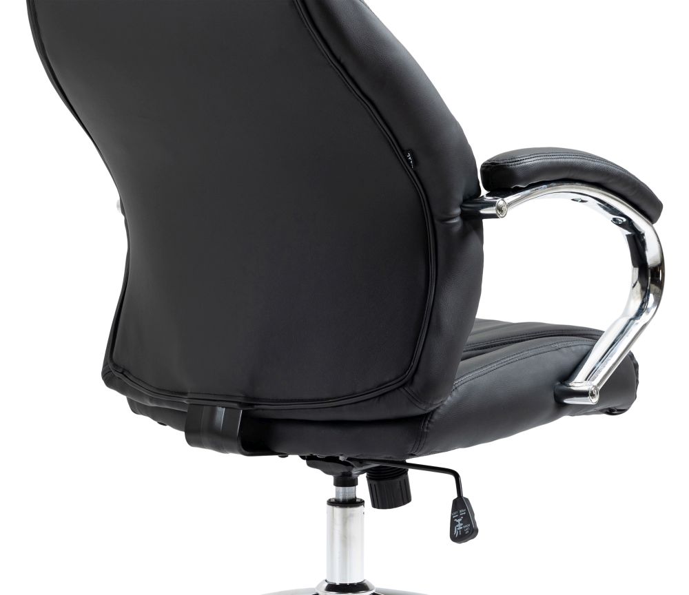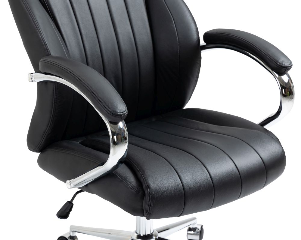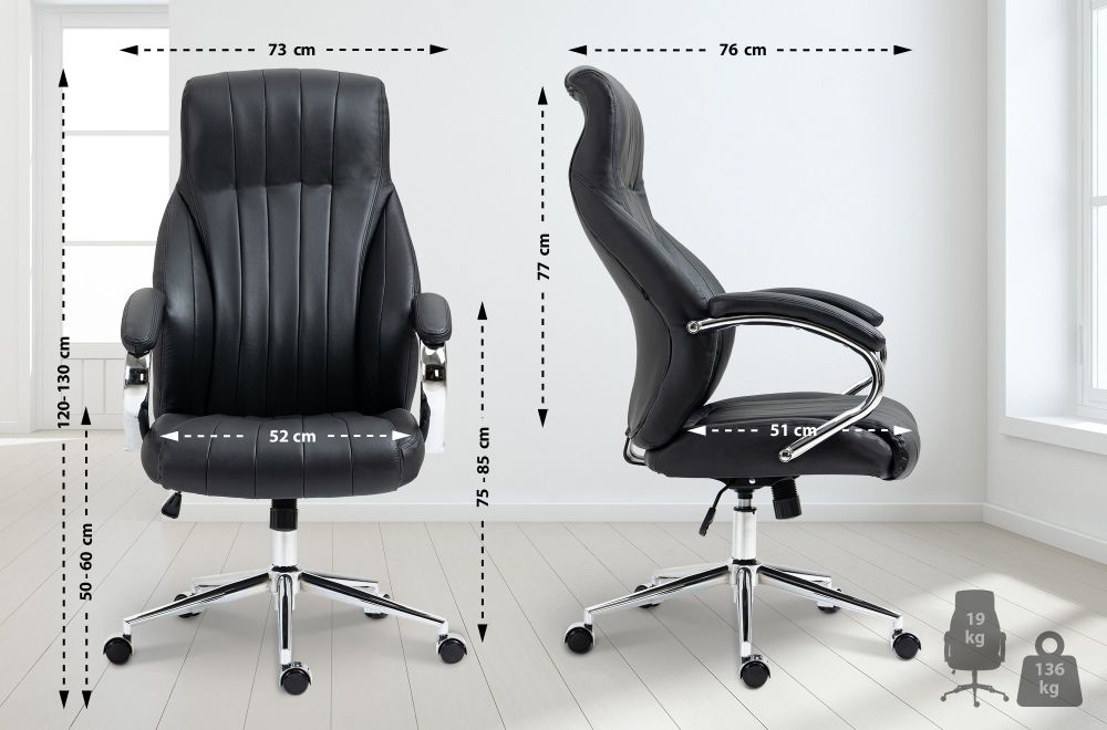 Der Bürostuhl Wigan kombiniert exklusive Materialien mit durchdachter Ergonomie für den gehobenen Arbeitsplatz. Der Sitz und die Rückenlehne sind mit hochwertigem Rindsleder bezogen und bieten durch die großzügige Polsterung ein komfortables Sitzerlebnis – auch bei langer Nutzung. Die Rückenlehne in S-Form unterstützt die Wirbelsäule optimal und sorgt gemeinsam mit der stufenlosen Höhenverstellung für eine gesunde Sitzhaltung. Der integrierte Wippmechanismus fördert eine dynamische Sitzposition, während das stabile Metallgestell in Chromoptik für einen sicheren Stand sorgt. Mit fünf Leichtlaufrollen bleibt der Stuhl auch in Bewegung flexibel und leicht steuerbar – unabhängig vom Bodenbelag.