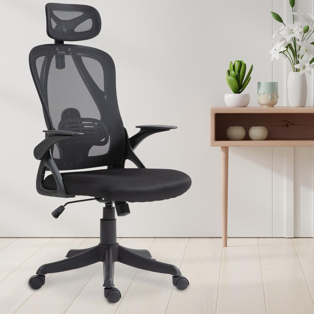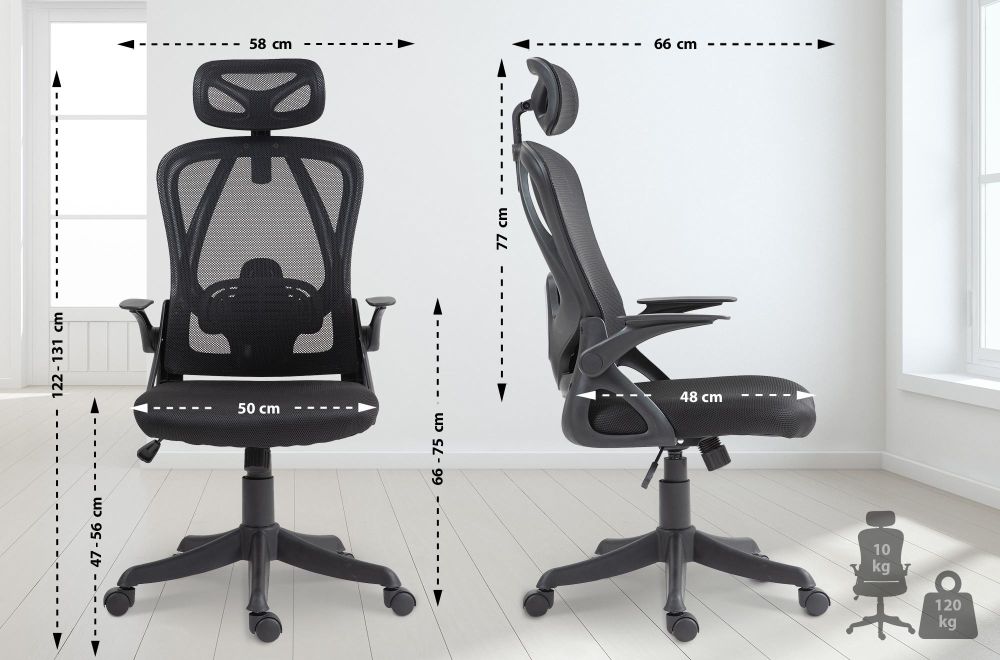 Die Kopfstütze ist höhenverstellbar und ebenso wie die Rückenlehne mit atmungsaktivem Netzstoff bezogen – das sorgt für angenehme Luftzirkulation auch an langen Arbeitstagen. Die gepolsterten Armlehnen unterstützen die Schulter- und Nackenpartie und lassen sich bei Bedarf einfach hochklappen, etwa für mehr Bewegungsfreiheit oder zum Verstauen des Stuhls unter dem Tisch.
