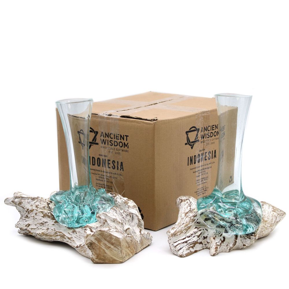 Dieses handgefertigte Molten Glass auf Whitewash Wood – Vase – Medium wird in Bali aus recyceltem Glas und balinesischem Gamal-Holz hergestellt. Die Vase vereint die besten Elemente zweier Welten: Natur und Handwerk, Erdverbundenheit und Eleganz sowie praktische und dekorative Funktion. Das Glas wird mundgeblasen und solange es noch heiß ist, über ein Stück Gamal-Wurzel gelegt. Dabei härtet es an die Form des Holzes aus und passt sich perfekt an.