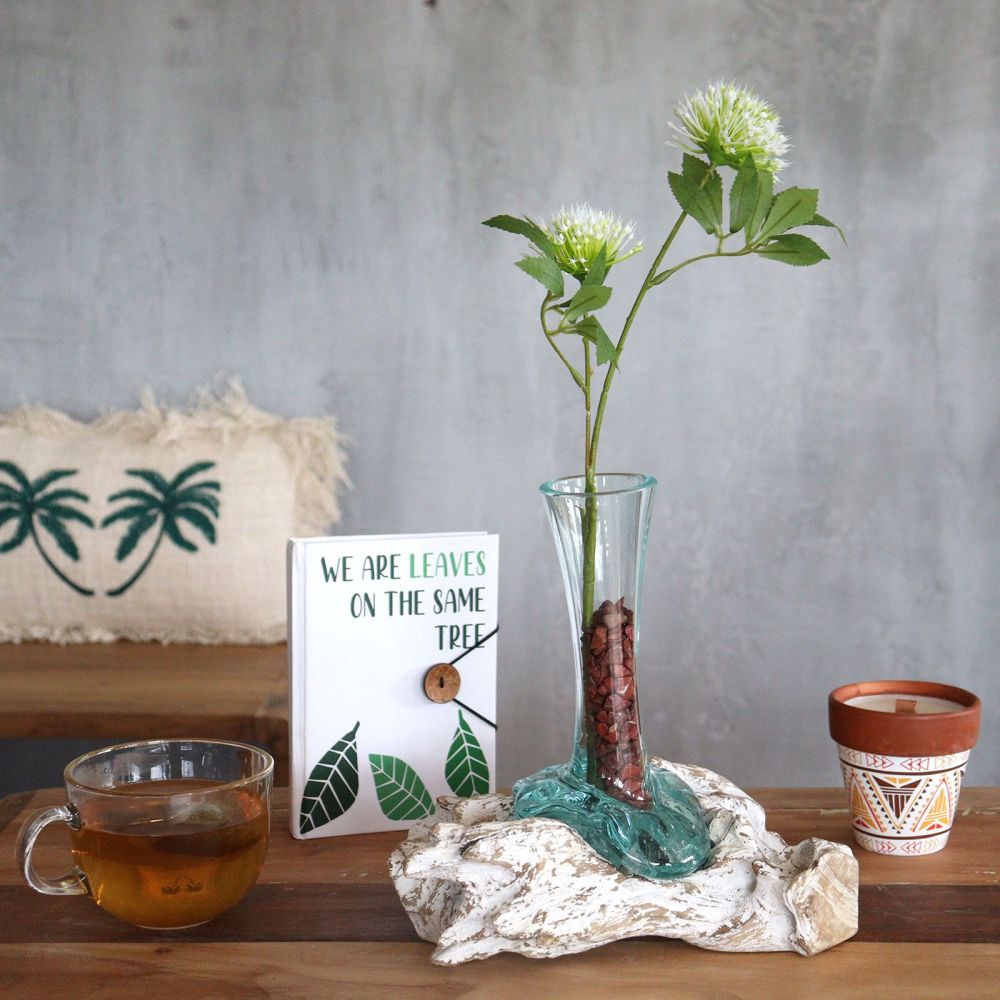 Die Fertigung erfolgt nach traditionellen balinesischen Methoden mit handgeführten Werkzeugen. Jedes Stück ist einzigartig, da sowohl das nachhaltige Holz als auch das recycelte Glas individuell geformt werden. Diese Vase eignet sich ideal für Blumen, Luftpflanzen, Steine oder als dekoratives Highlight in deinem Wohnraum. Weitere tolle Stücke aus der Glass-on-Wood-Serie sind in unserem Shop erhältlich.
