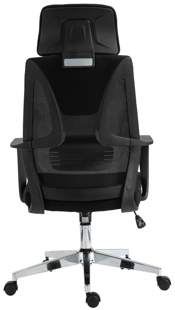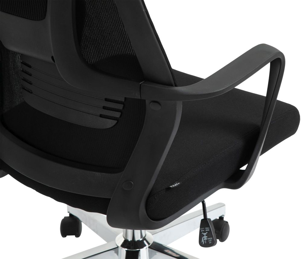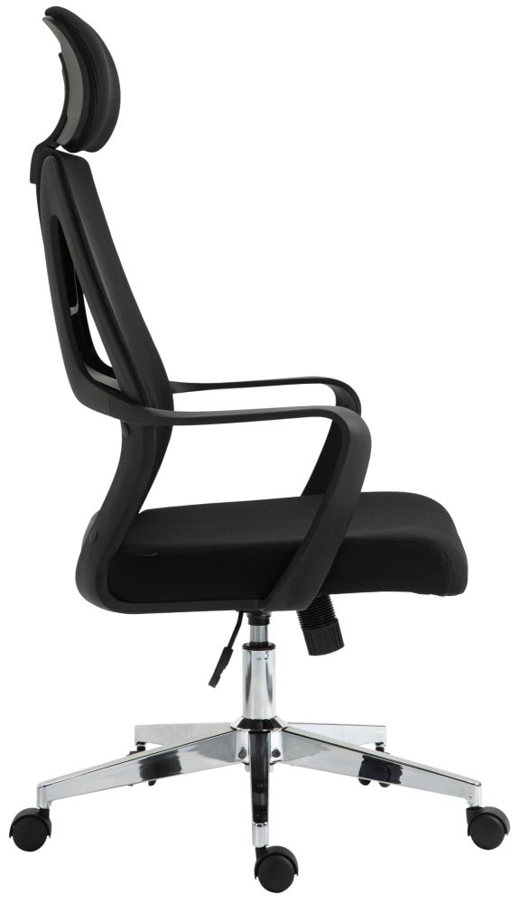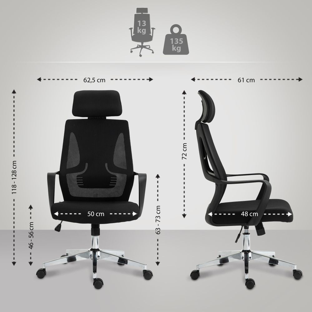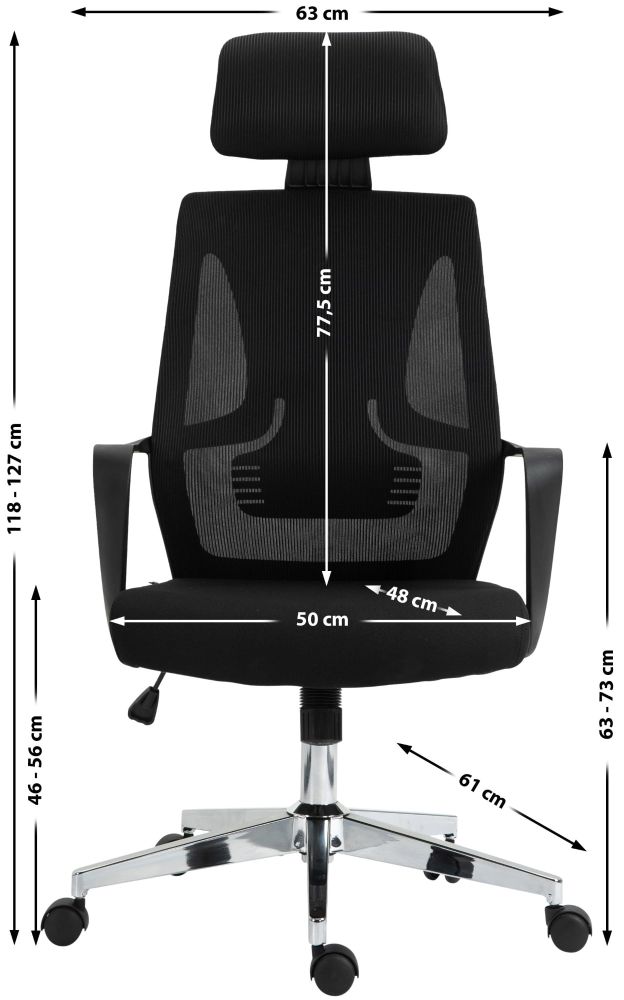 Der Bürostuhl Kanab kombiniert moderne Ergonomie mit funktionalem Design für angenehme Sitzzeiten im Büro oder Homeoffice. Die hohe Rückenlehne mit integrierter Lendenstütze fördert eine gesunde Körperhaltung, während die verstellbare Kopfstütze individuell angepasst werden kann. Die atmungsaktive Netzbespannung im Rückenbereich sorgt für gute Luftzirkulation – ideal für längeres Sitzen. Dank der stufenlosen Höhenverstellung lässt sich der Stuhl optimal auf Ihre Sitzposition abstimmen. Ein stabiles Metallgestell in Chromoptik und fünf Leichtlaufrollen sorgen für Beweglichkeit und sicheren Stand. Der Kanab ist robust verarbeitet und bis zu 135 kg belastbar – eine zuverlässige Lösung für den Büroalltag.