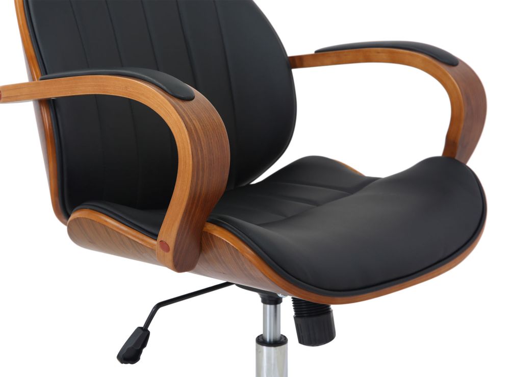 Der Bürostuhl Melilla überzeugt durch modernes Design und angenehmen Sitzkomfort – ideal für den täglichen Einsatz im Büro oder Home-Office. Die bequeme Polsterung ist mit hochwertigem Kunstleder bezogen und sorgt gemeinsam mit der hohen Rückenlehne für ein komfortables Sitzerlebnis. Der robuste Bugholzrahmen verleiht dem Stuhl eine edle Optik und bietet gleichzeitig Stabilität. Dank der stufenlosen Höhenverstellung und der 360° Drehfunktion lässt sich der Stuhl individuell anpassen. Der integrierte Wippmechanismus fördert eine aktive Sitzhaltung. Das stabile Metallgestell mit fünf Leichtlaufrollen gewährleistet Mobilität auf verschiedenen Bodenbelägen. Der Melilla ist eine stilvolle Alternative zum klassischen Bürostuhl und wertet jeden Arbeitsplatz optisch auf.