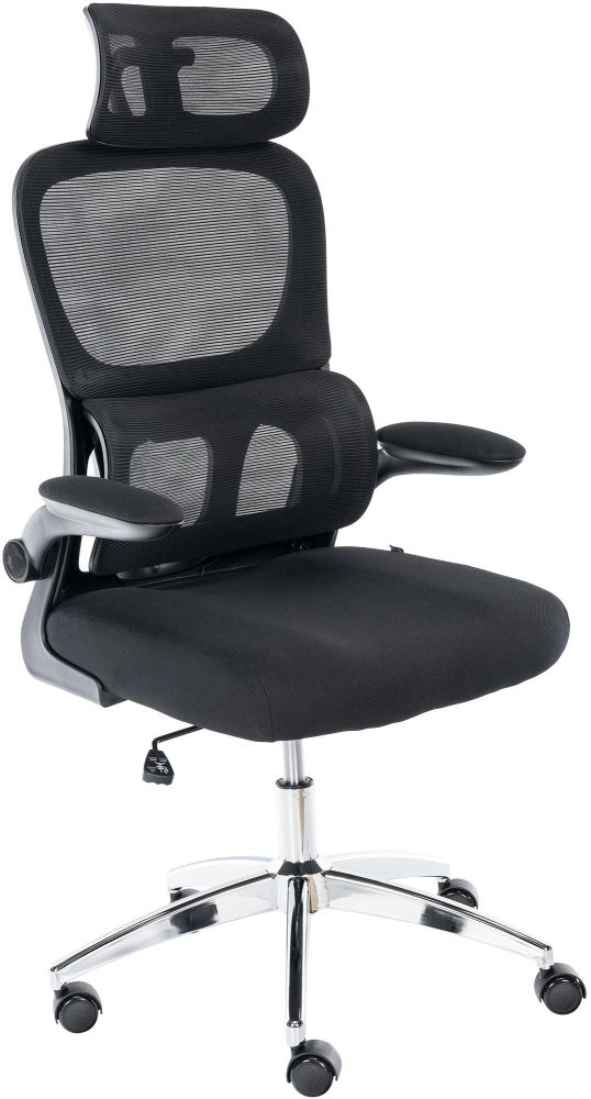 Der atmungsaktive Meshbezug unterstützt die Luftzirkulation und sorgt für angenehmes Sitzen, auch über längere Zeit. Die gepolsterte Sitzfläche bietet hohen Komfort, während die klappbaren Armlehnen platzsparendes Verstauen unter dem Schreibtisch ermöglichen.
