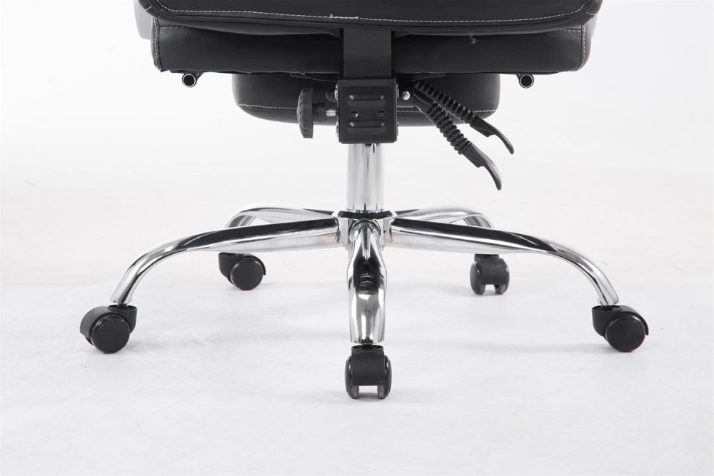 Für zusätzlichen Komfort sorgt die integrierte, leicht verstellbare Fußstütze, mit der sich die Beine zwischendurch bequem hochlegen lassen. Auch die Rückenlehne lässt sich anpassen, um eine kurze Pause im Sitzen optimal zu gestalten. Der Stuhl ist stufenlos höhenverstellbar und drehbar, sodass ergonomisches Arbeiten jederzeit möglich ist. Das stabile Metallgestell in Chromoptik bietet zusammen mit fünf Leichtlaufrollen maximale Beweglichkeit – auf Teppich- wie Hartböden.