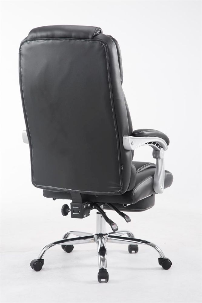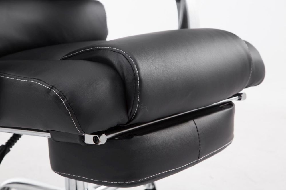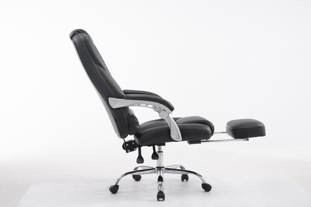 Für zusätzlichen Komfort sorgt die integrierte, leicht verstellbare Fußstütze, mit der sich die Beine zwischendurch bequem hochlegen lassen. Auch die Rückenlehne lässt sich anpassen, um eine kurze Pause im Sitzen optimal zu gestalten. Der Stuhl ist stufenlos höhenverstellbar und drehbar, sodass ergonomisches Arbeiten jederzeit möglich ist. Das stabile Metallgestell in Chromoptik bietet zusammen mit fünf Leichtlaufrollen maximale Beweglichkeit – auf Teppich- wie Hartböden.