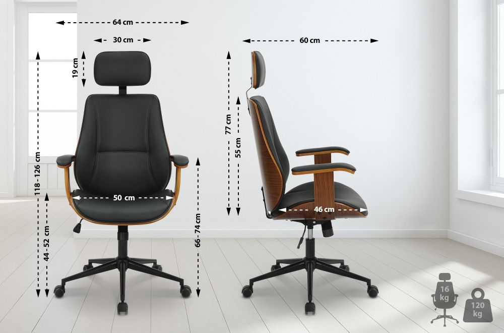 Der Bürostuhl Lugo kombiniert hohen Sitzkomfort mit edlem Design – perfekt für moderne Büros, Arbeitszimmer oder Gaming-Setups. Die Kombination aus weichem Kunstlederbezug und dekorativer Holzrückseite macht diesen Chefsessel zu einem echten Blickfang. Für ergonomisches Sitzen sorgen die gepolsterte Kopfstütze, die komfortablen Armlehnen sowie eine hohe, weich gepolsterte Rückenlehne.