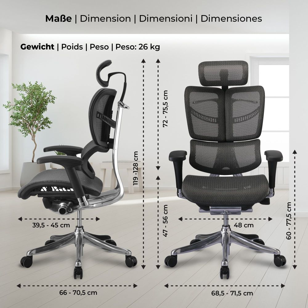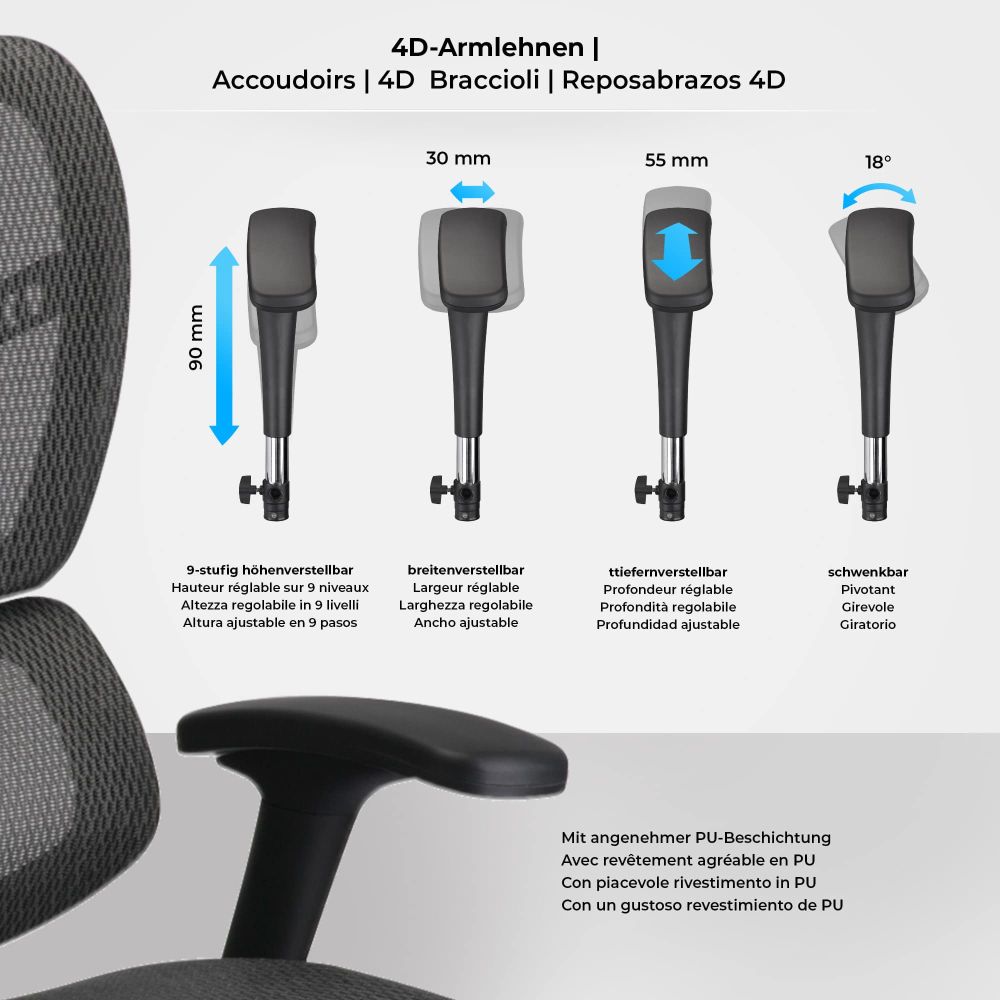 - 4D-Armlehnen: höhen-, tiefen-, breitenverstellbar, schwenkbar