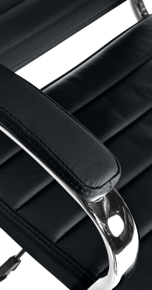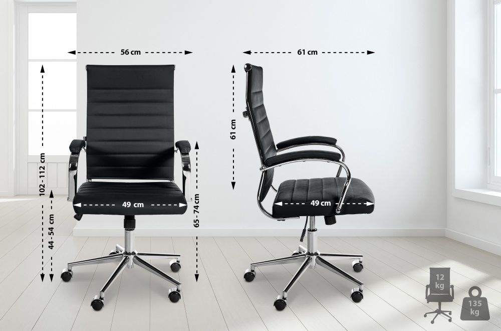 Der Bürostuhl Mollis verbindet exklusives Design mit ergonomischem Komfort – ideal für stilvolle Arbeitsumgebungen. Der Bezug aus hochwertigem, genarbtem Echtleder mit horizontaler Steppung verleiht dem Stuhl eine elegante und zugleich markante Optik. Die ergonomisch geformte Rückenlehne und die gepolsterten Armlehnen bieten optimalen Halt während langer Sitzphasen. Dank stufenloser Höhenverstellung, 360° Drehfunktion und integrierter Kippfunktion mit Arretierung lässt sich der Stuhl individuell anpassen. Das stabile Metallgestell in Chromoptik unterstreicht den hochwertigen Charakter und bietet zuverlässige Standfestigkeit. Mit fünf leichtgängigen Rollen ist der Mollis mobil auf Hart- und Teppichböden einsetzbar und bis zu 135 kg belastbar.