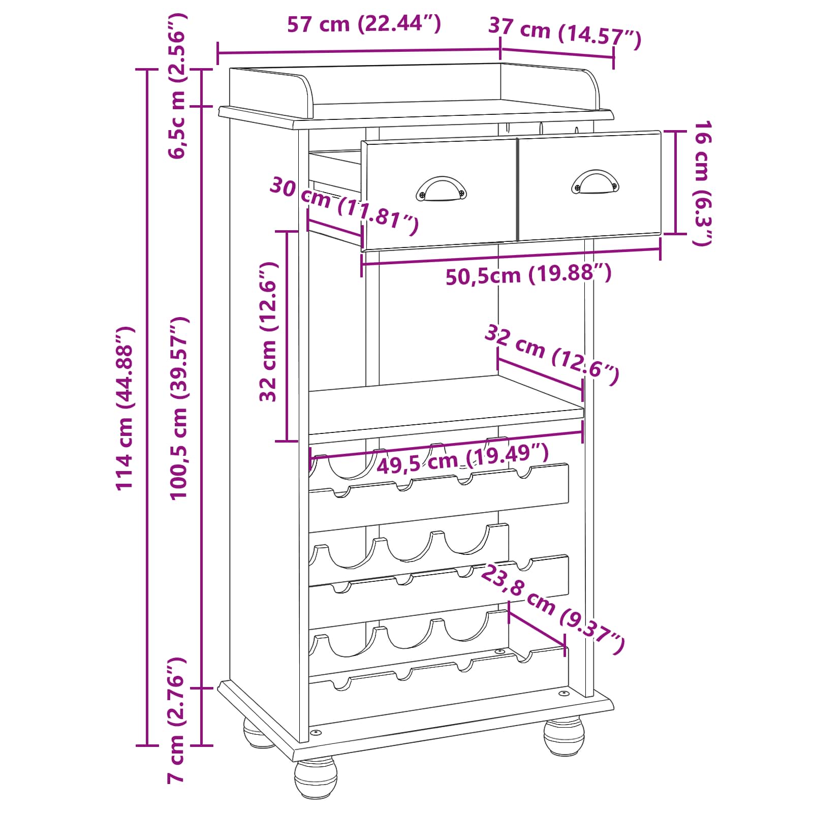 Mit seinen kompakten Maßen von 57 x 37 x 114 cm bietet der Schrank großzügigen Stauraum auf kleinem Raum. Er ist mit offenen Fächern zur Flaschenaufbewahrung, Schubladen für Zubehör und einem großzügigen oberen Regal ausgestattet. Hier lassen sich Weinflaschen ordentlich sortieren und stilvoll präsentieren. Die Kombination aus massivem Kiefernholz und Holzwerkstoff sorgt für Langlebigkeit und Formstabilität – ideal für den täglichen Gebrauch im Innenbereich.