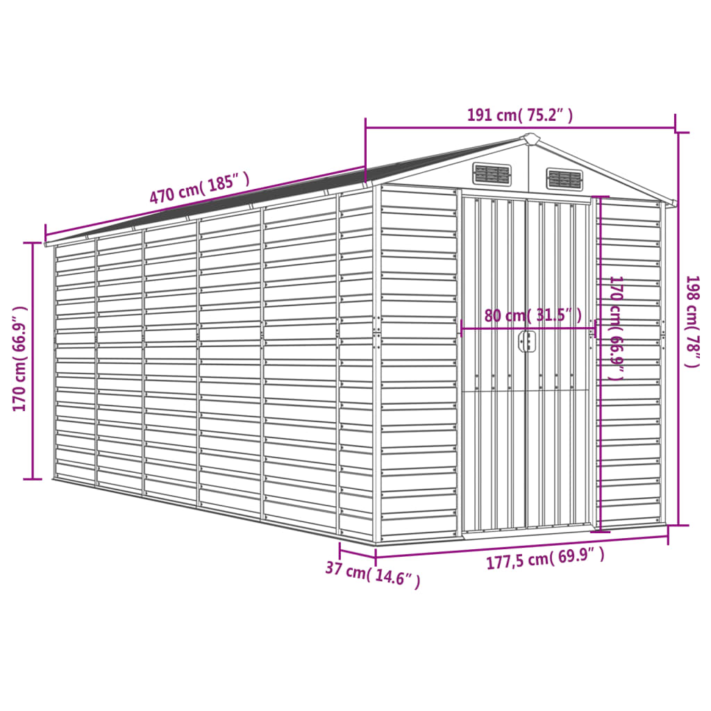 Dieses Gartenhaus bietet eine zuverlässige Möglichkeit, Werkzeuge, Geräte oder Brennholz sicher im Freien zu lagern. Gefertigt aus verzinktem Stahl, überzeugt der Schuppen durch seine hohe Robustheit und Langlebigkeit. Das Material ist rostfrei und besonders widerstandsfähig gegenüber Witterungseinflüssen, was eine Nutzung über viele Jahre hinweg ermöglicht. Die Verzinkung sorgt zusätzlich für Schutz gegen Korrosion und macht das Gartenhaus ideal für den Einsatz in verschiedenen Außenbereichen und unter rauen Bedingungen.